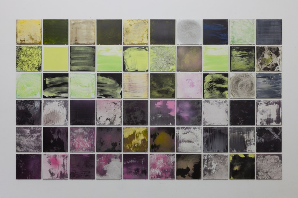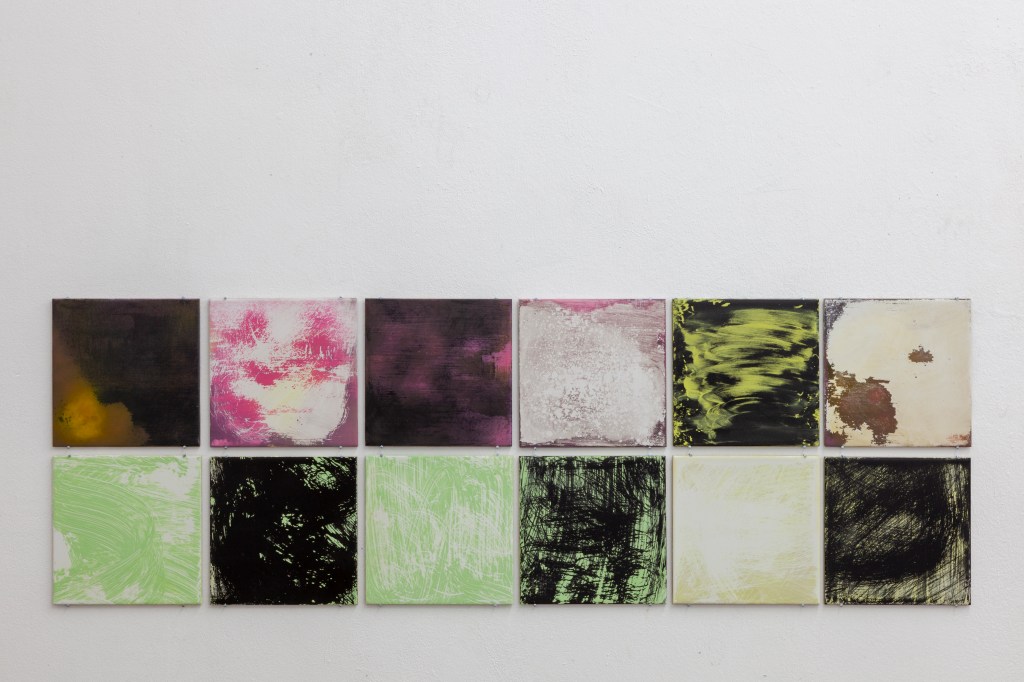 100 ceramic tiles, (here: 57), diverse cleaning agents, pigments (Variable dimensions)