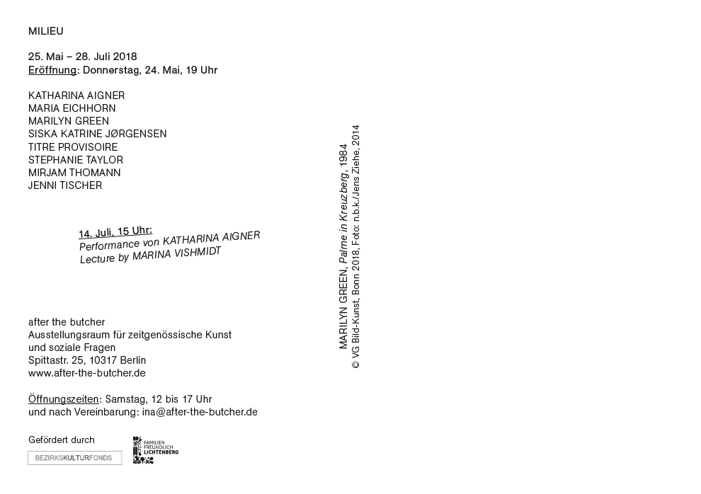 Theories of the environment are always also theories of possible worlds. In this sense, the term milieu describes both possibility conditions and permeabilities. It focuses on what is conceivable or inconceivable under specific conditions, thus raising questions as to the perceptibility and representability of the environment. That is indeed reminiscent of art. The view of humans to their environment is thus a view that is itself determined by this environment, it is a corporeally determined view. Milieu, then, describes the relationship between body and environment, the interpenetration of environment and that which is in the environment. Are you aware that you are simultaneously a component and viewer of a state? That sounds pretty fictive and otherworldly! You inhabit the milieu and the milieu inhabits you. Precisely the engagement with this other makes the milieu conceivable, writes Maria Muhle, thus defining the place where the norm of life develops. It is autonomy and heteronomy, determination and agency, tension and complicity, susceptibility and dissolution of boundaries. Complicated conditions and palm trees in Kreuzberg.