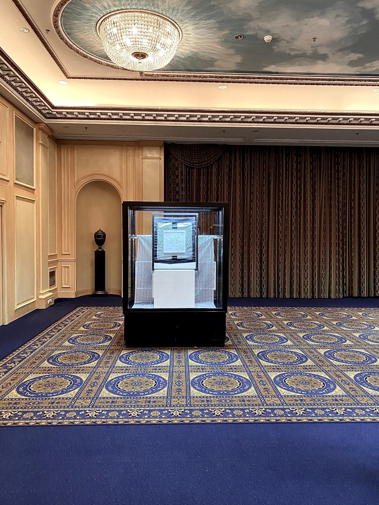 INTERCONTI WIEN brings together thirteen Viennese galleries in the iconic conference halls of Hotel InterContinental Vienna. Each gallery presents one artist in a historical vitrine provided by the MAK Museum of Applied Arts. The innovative online format offers audiences an experience that goes beyond the traditional online viewing room. It features a continuous video stream of on-site installation views and interviews with participating galleries and artists, providing visitors with an immersive experience of the actual set-up, location, and art on view.