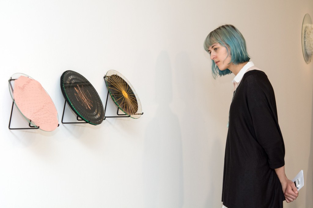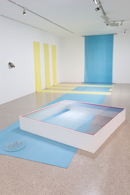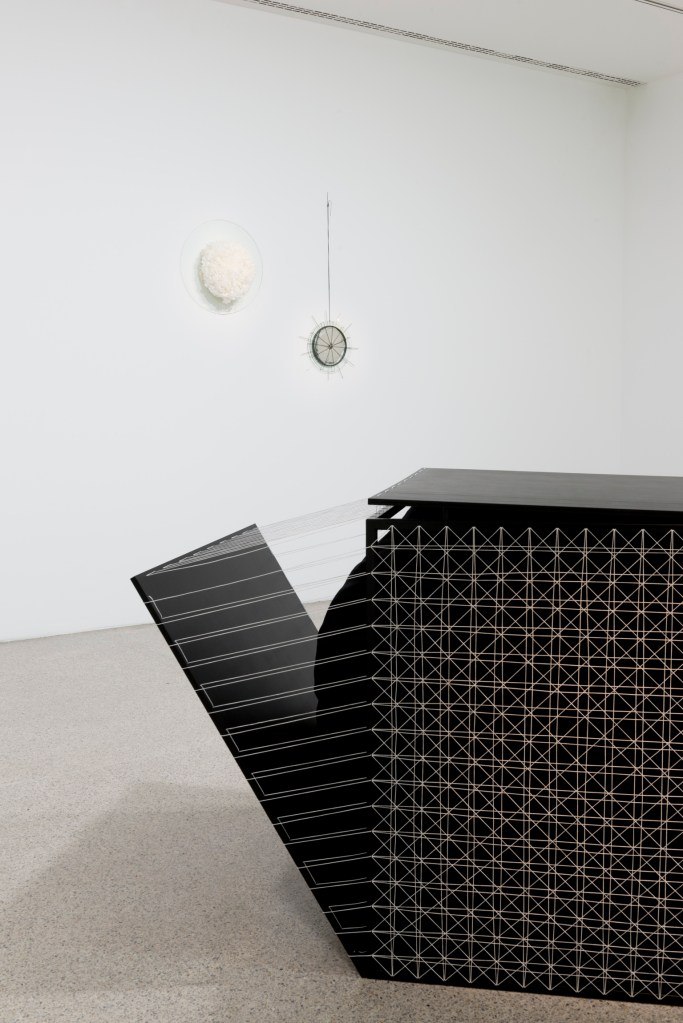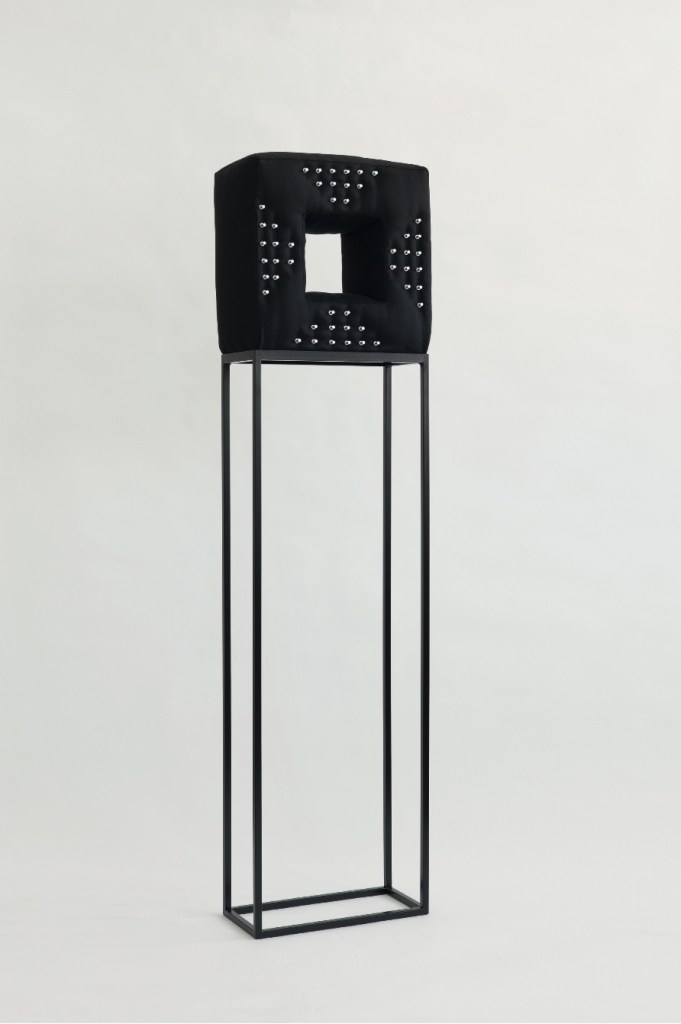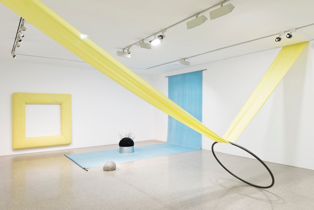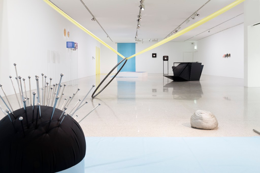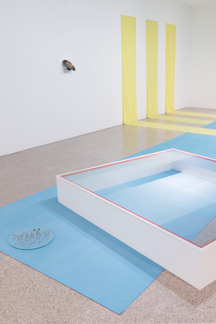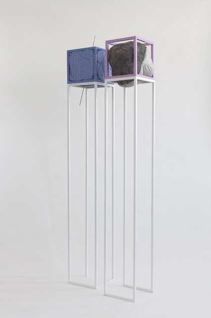 In Jenni Tischer’s exhibition Pin at mumok the vocabulary of minimalist sculpture comes up against the history and practice of textile work. Reminiscent of unrolled scrolls, situation-adaptable and colored “fabric pedestals” cut across the room. Interlocking walls and floor, they display a number of sculptures: open cubes that feature “Viennese netting” like Thonet chairs, and objects whose materiality or form allude to weaving frames and pin cushions. Unlike conventional exhibition setups, Tischer’s arrangement leaves the question open as to what is part of the display and what is an art work. Instead, display elements such as pedestals or frames form an integral part of the narrative. Pin addresses fundamental questions: What is a medium, and what kind of information can it convey? How are work processes inscribed in materials and surfaces? And why do textiles, as field of discourse and practice, have a momentum in the digital age? In-between “pins” (needles) and PINs (personal identification numbers), Tischer’s exhibition stakes out a realm where questions of the memory of materials and the encoding of identities are equally considered.